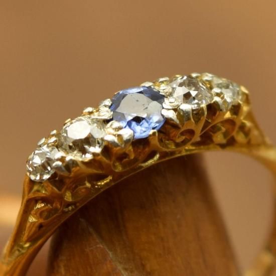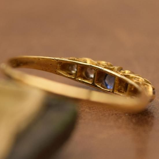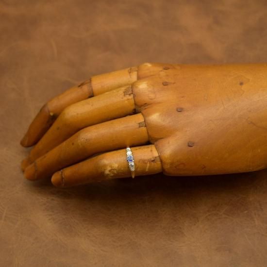 中央にブルーサファイアを一石、その両側にダイヤモンド四石、